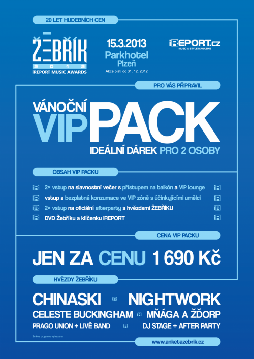 Soutěž o 3 Vánoční VIP packy Žebřík 2012! Každý obsahuje 2x vstup na slavnostní večer s přístupem na balkón a VIP lounge, bezplatná konzumace ve VIP zóně, 2x vstup na oficiální afterparty s hvězdami Žebříku, DVD Žebřík a klíčenku iREPORT. Finálový večer proběhne 15. března v Parkhotelu Plzeň.